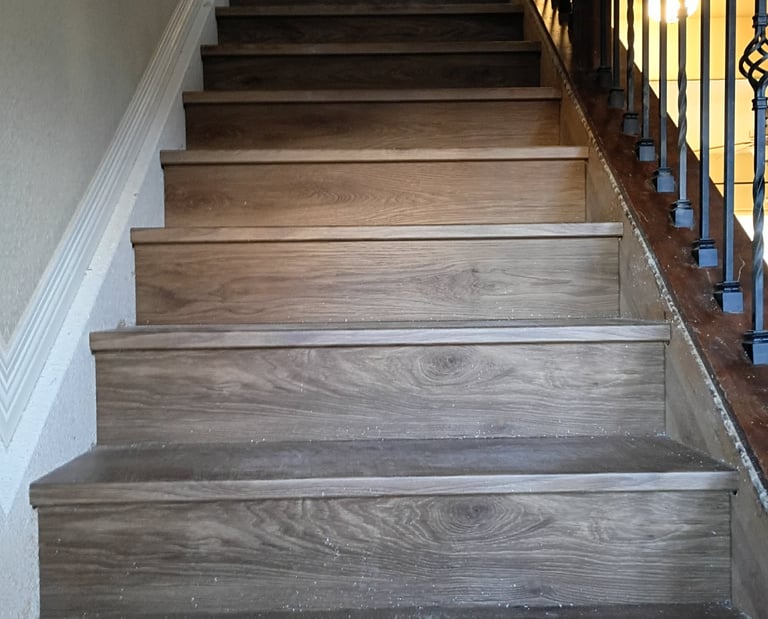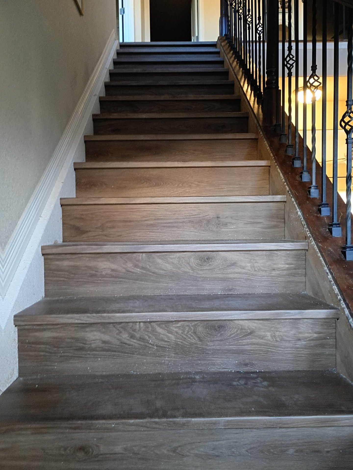 In this job we removed all the old flooring throughout the house, including removing all the carpet from the stairs. After removing the carpet, we had to cut off the extra piece of stair nosing so that the stair treads would fit perfectly and no wood would be showing.